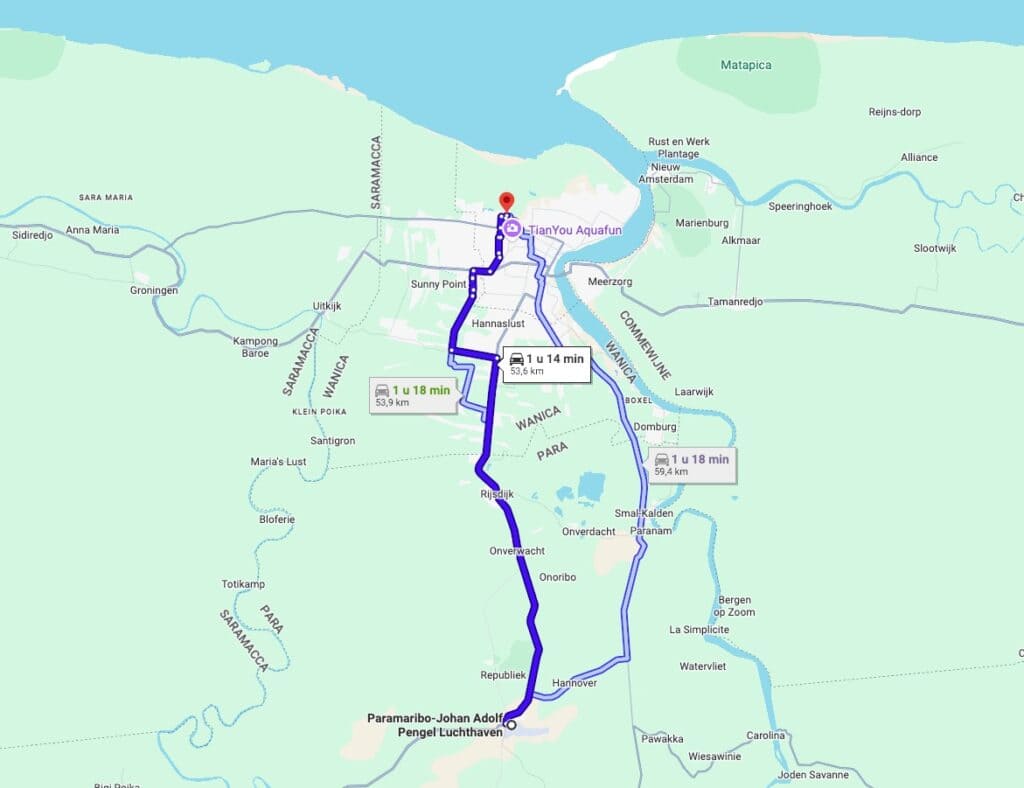 The trip from Johan Adolf Pengel International Airport to Paramaribo takes an average of 60 to 75 minutes, depending on traffic.