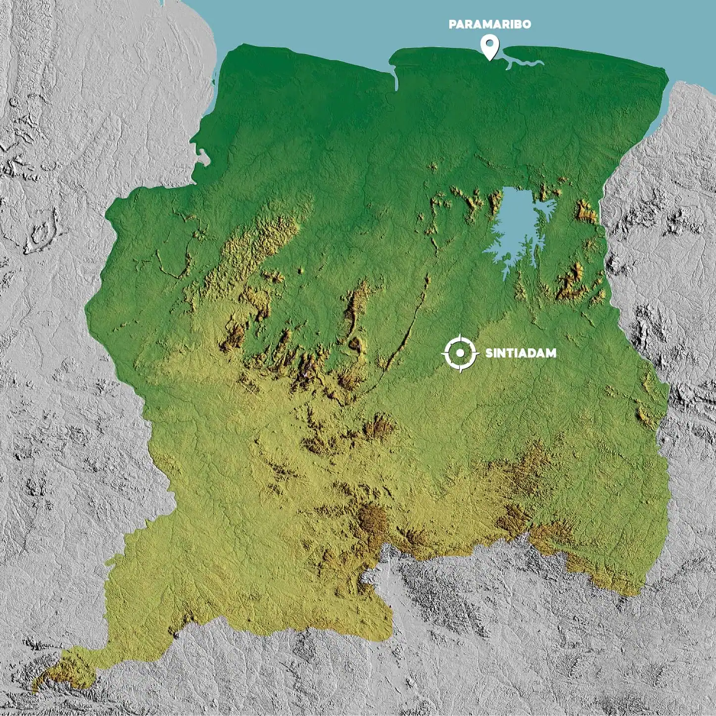 Sintiadam está situada en el centro de la vírgene región amazónica a lo largo del Gran Río (Surinam).