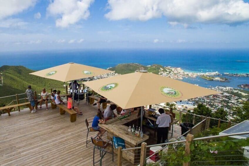 Na een korte oriëntatie stap je aan boord van de Sky Explorer voor de rit van ongeveer 25 minuten naar de top van Sentry Hill, de hoogste hoogte van St. Maarten op 1.125 voet. Een reeks platforms omringt de bergtop en biedt 360-graden uitzichten over het hele eiland, inclusief uitzichten op de naburige eilanden Saba, St. Eustatius, St. Barts en Anguilla.
